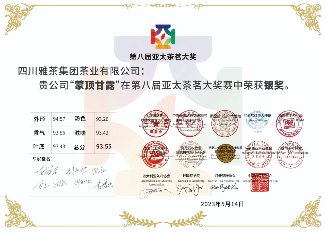 經(jīng)過激烈的角逐,公司“蒙頂甘露”在378個茶葉樣品中脫穎而出獲得銀獎。