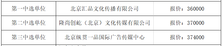 1、根據(jù)報價最低者中選法,我單位確定北京匯品文化傳播有限公司成為本次采購項目的中選供應(yīng)商。